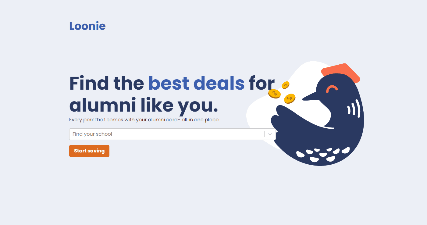 Loonie is a project that I work on with two other people (a designer and a product manager) during our spare time. Canadian colleges and universities often have alumni discounts and offers, but many alumni don't know about them or can't find them. Our answer to this is Loonie, a website aggregating alumni deals for post-secondary alumni.