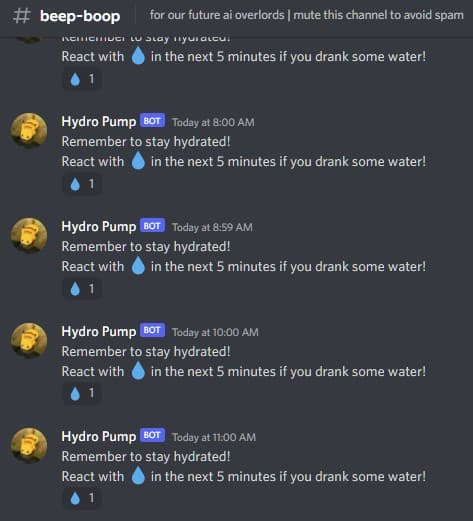 Hydro Pump is a Discord bot that I created to remind users of a Discord server to stay hydrated. The bot sends scheduled reminders (configurable to hourly or daily) to drink water.